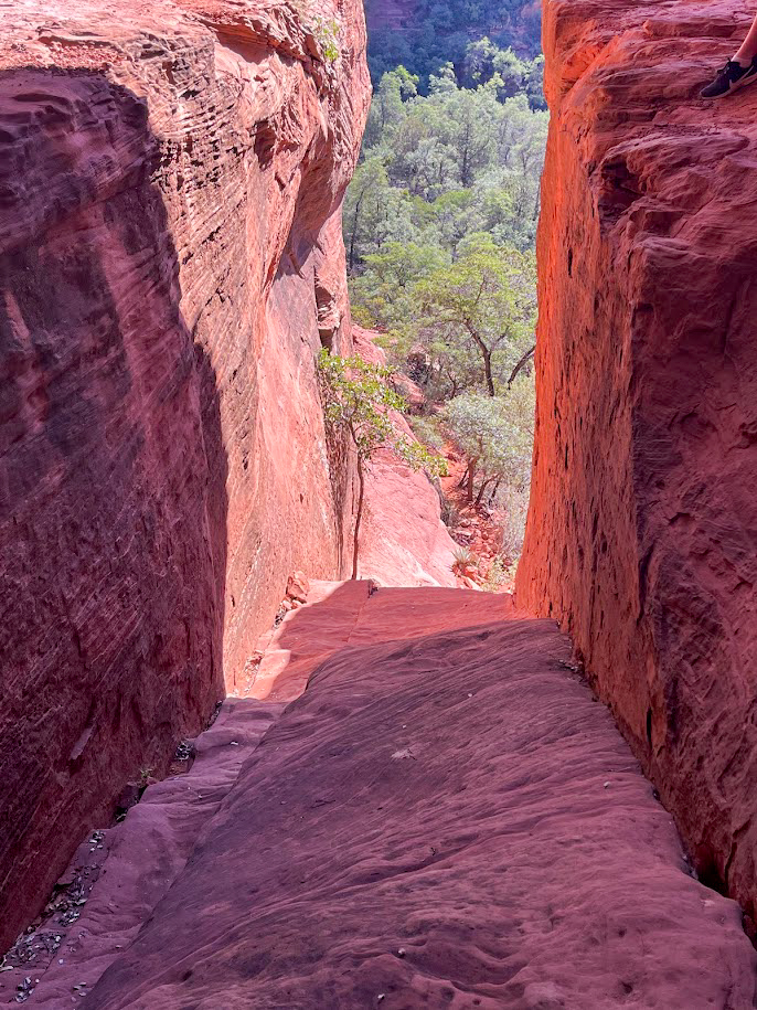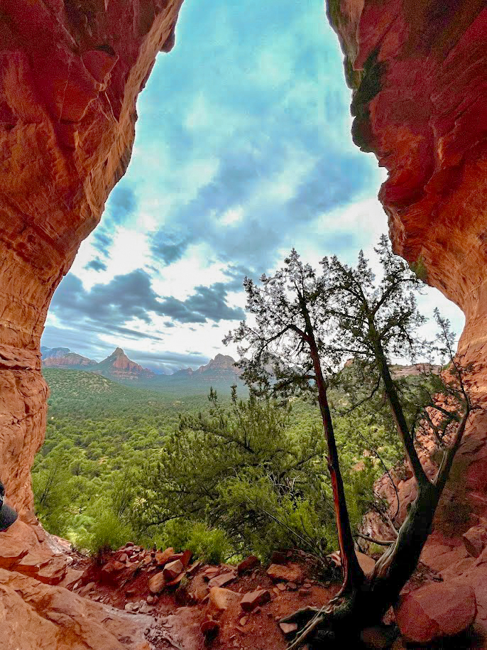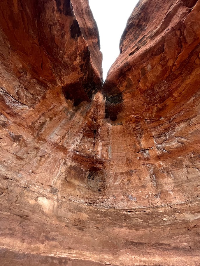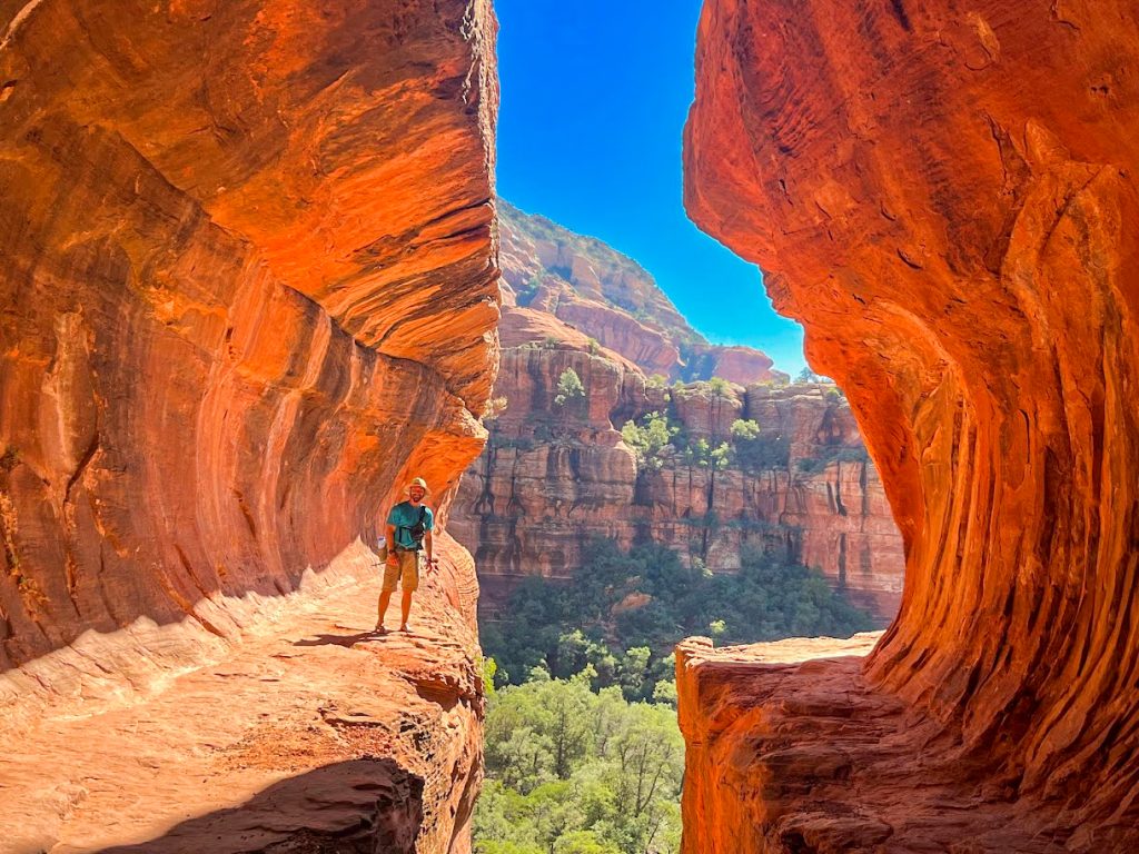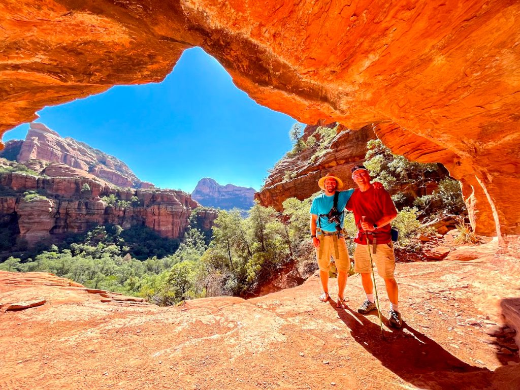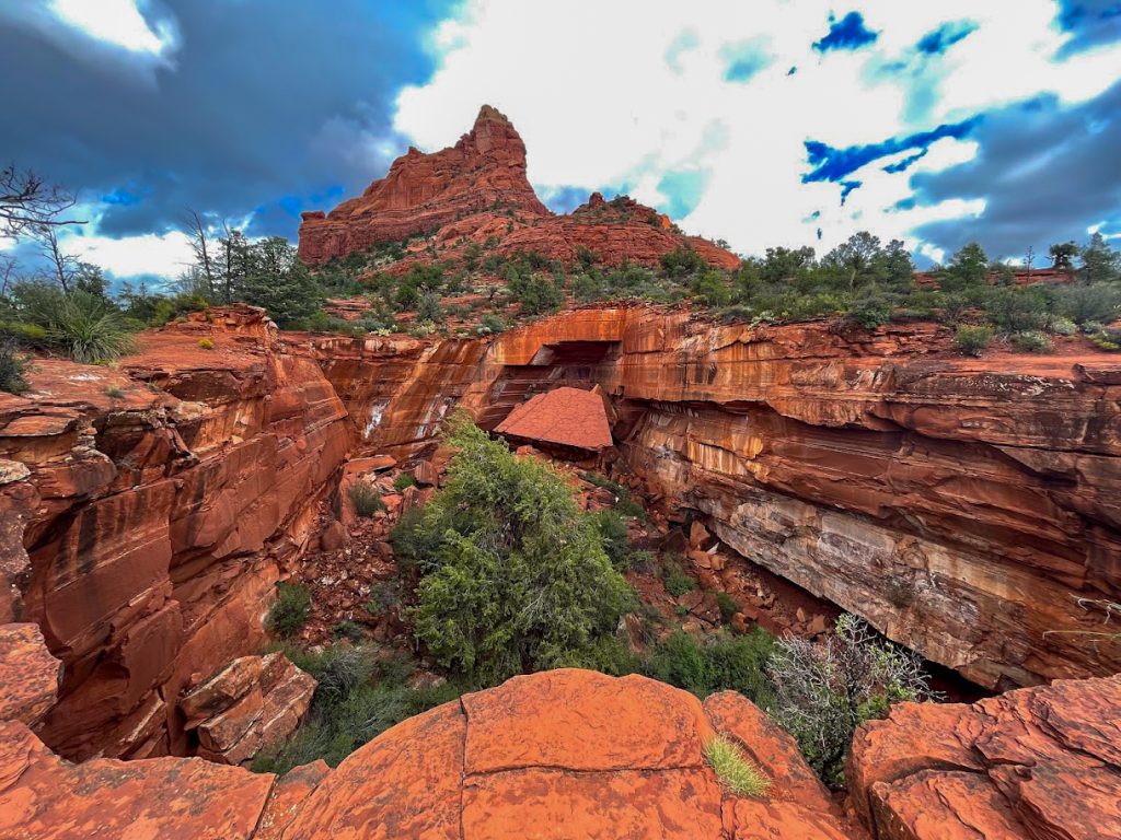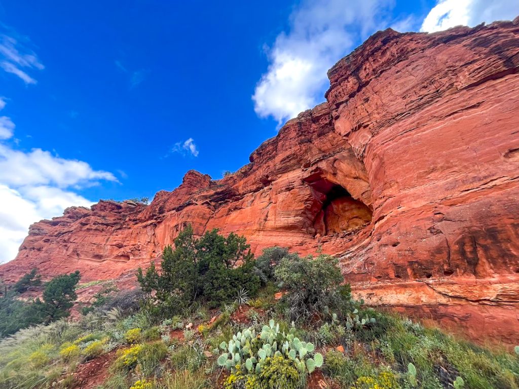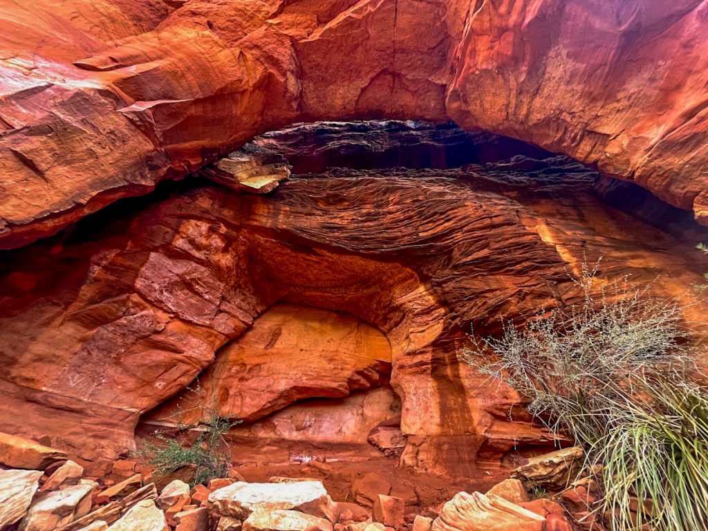 This “cave” is actually more of a double arch underneath a sandstone cliff, but it is quite unique. The arch features an upper-level arch and chamber that you can reach via some scrambling. This stretch does require good scrambling skills and surefootedness. If you are unsure about climbing to the upper levels of this landmark, I would recommend remaining below. If you scramble to the upper level of this feature, there are many different viewing angles that are photo worthy. I would absolutely add this landmark to your sights to see while in Sedona.