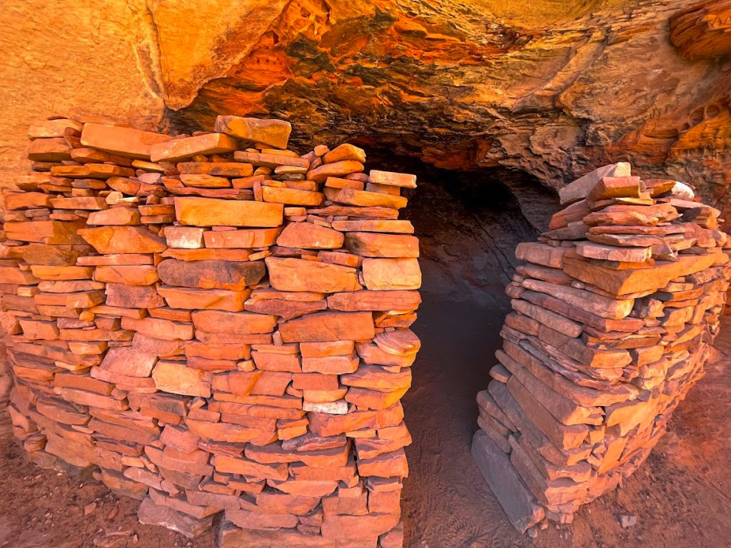 Once you reach the Subway Cave, there is a very steep scramble up sandstone to reach the cave. Some people go to the left here instead. This route is slightly less intense and leads you to another Native American structure. From here, you can wrap around a cliff face to reach the Subway Cave. There is one stretch where you are on a high and narrow ledge if you take this route. Watch your footing and cling to the cliff face for safety. I would not recommend going up into the Subway Cave for novice hikers or anyone with a fear of heights.